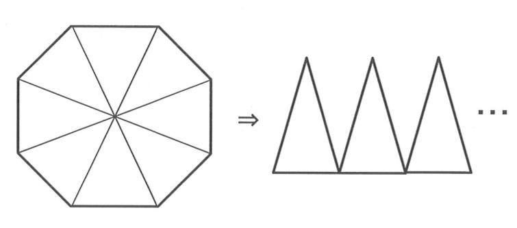 | 2.この三角形の布4枚を使って、バッグの胴を作ります。大きさによっては6枚でもよいでしょう。 | ![]() ![]() |