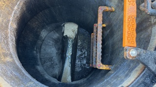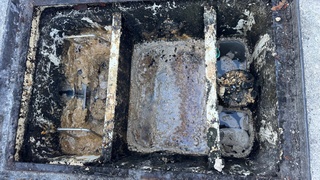 グリストラップから油脂等があふれ出てしまい、下水道管の流れを阻害してしまっている様子。