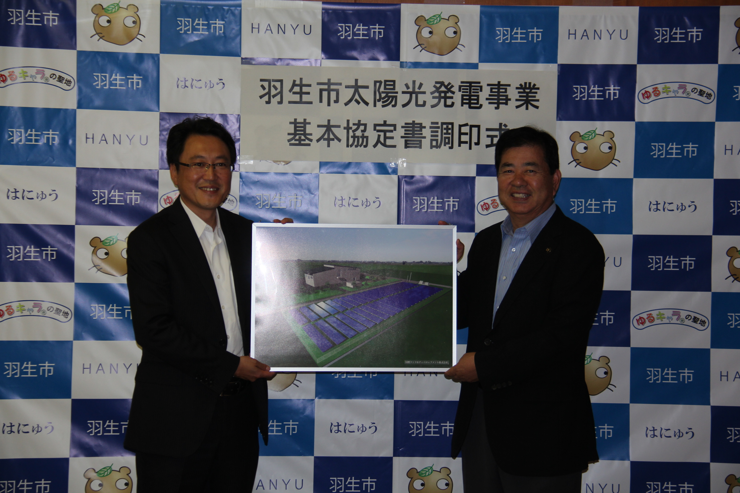 公開日 2013年07月23日 更新日 2015年02月25日 平成25年7月18日に羽生市役所公室で基本協定書の調印式を行いました 下村君地内の遊休地を有効活用して大規模太陽光発電施設を建設するために、国際ランド&ディベロップメント株式会社との間で基本協定書を締結しました。この協定書締結により、平成26年1月の運転開始に向けて事業が動き始めます。 太陽光発電事業の概要 (1)事業地 羽生市大字下村君字中谷1292番ほか (2)発電能力 太陽電池パネルの合計出力528kW (3)推定発電量 約55万kWh(年間) (4)発電開始時期 平成26年1月予定 お問い合わせ 経済環境部 環境課住所:埼玉県羽生市東6丁目15番地TEL:048-561-1121FAX:048-561-6380E-Mail:kankyou@city.hanyu.lg.jp