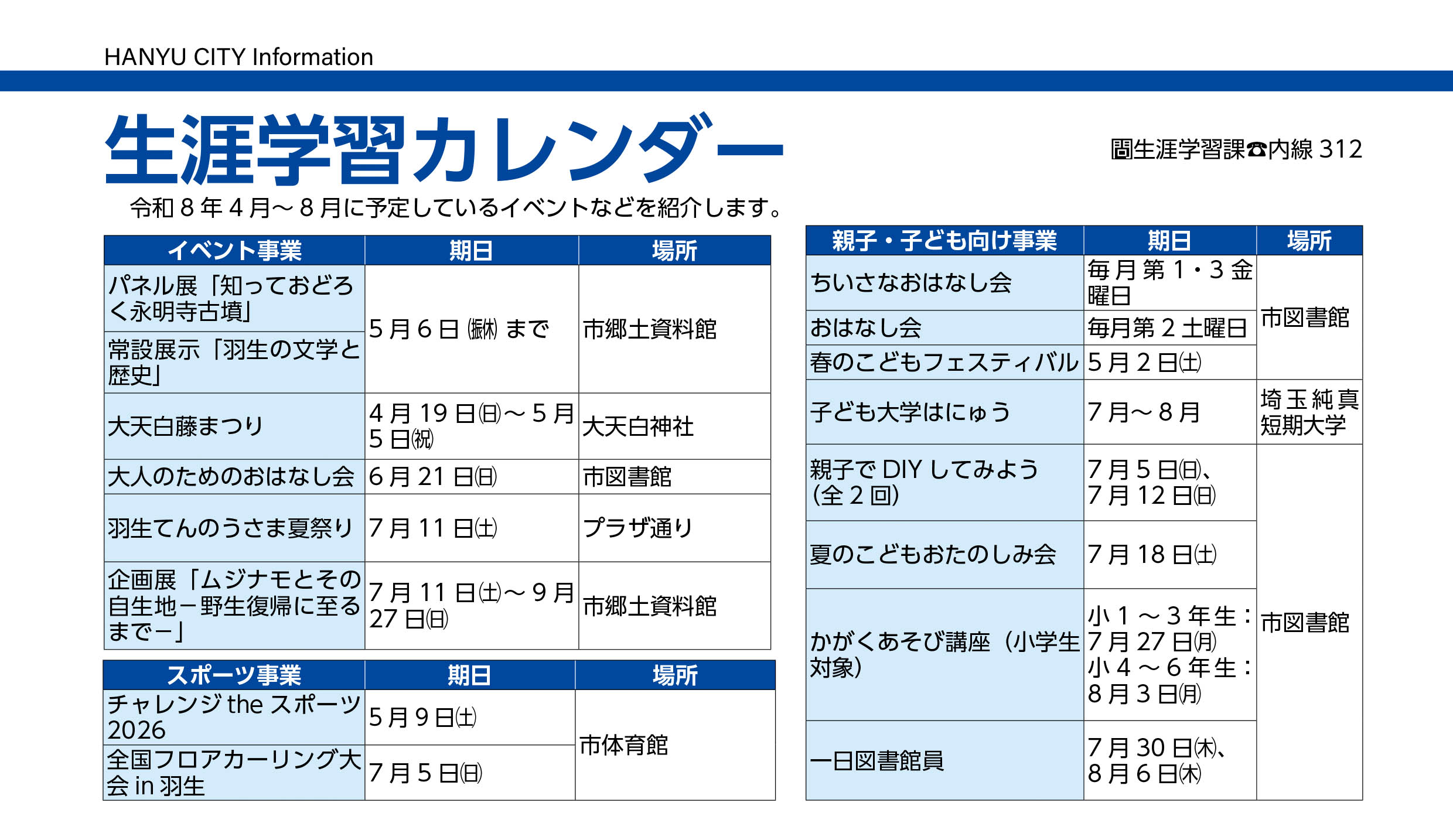 市民の皆様に学習情報を提供することを目的とし、市で予定しているイベント等を紹介します。