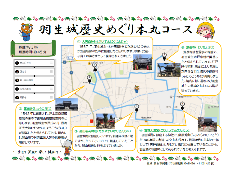 羽生城の歴史にまつわるウォーキングコースです。歴史を学びながら、ウォーキングで健康づくりをしましょう。このコースは、歩数管理アプリ「コバトンALKOOマイレージ」内のウォークラリーへも掲載しております。完歩すると1,500ポイントを獲得できます。