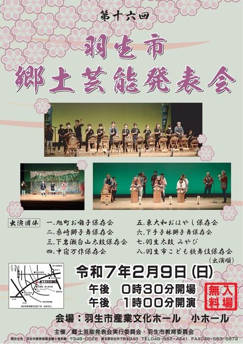 令和7年2月9日(日)、羽生市産業文化ホール小ホールにて「第16回羽生市郷土芸能発表会」が開催されました。獅子舞、太鼓、芝居、おはやしなど羽生の郷土芸能を各団体が披露しました。