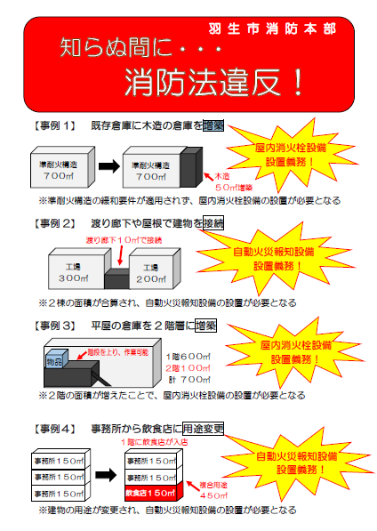 重大な消防法令違反のほとんどは、消防本部への届け出がないまま建物の増改築や接続、用途変更がされています。そのため、『知らない間に消防法令違反をしていた』という事態が起こってしまいます。そのような事態にならないように、建物の変更、事業の開始の際は計画の段階で消防本部へご相談下さい。