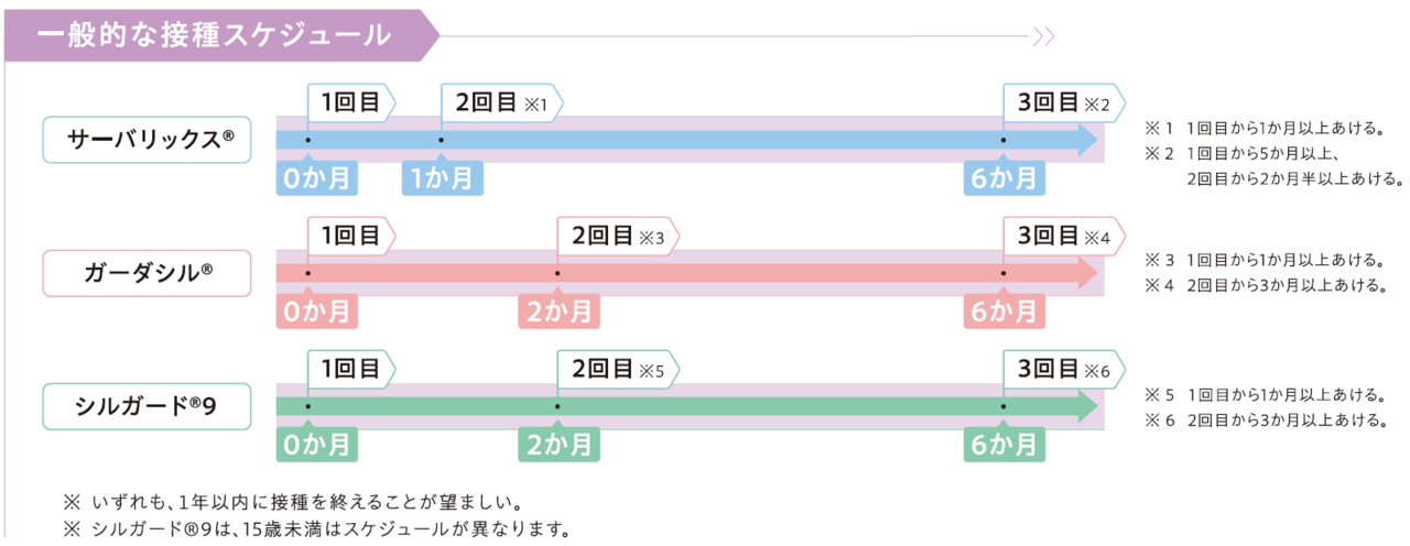 | サーバリックス(2価ワクチン) | 3回 | 1回目 | 2回目と3回目の接種がそれぞれ1回目の1か月後と6か月後にできない場合、2回目は1回目から1か月以上、3回目は1回目から5か月以上かつ2回目から2か月半以上あけます。 |