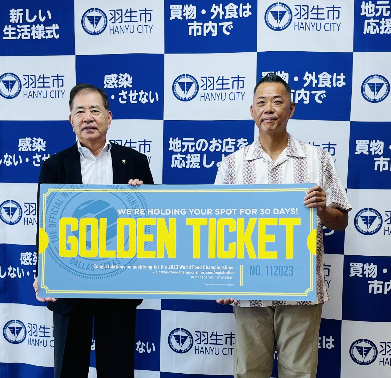 また、市長は食文化の発展と市のPRに大きく貢献されたとして渡邉さんに感謝状を贈呈し、渡邉さんからは優勝者に授与された世界大会へのチケットレプリカを市にプレゼントされました。