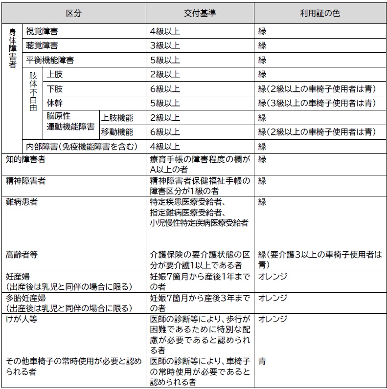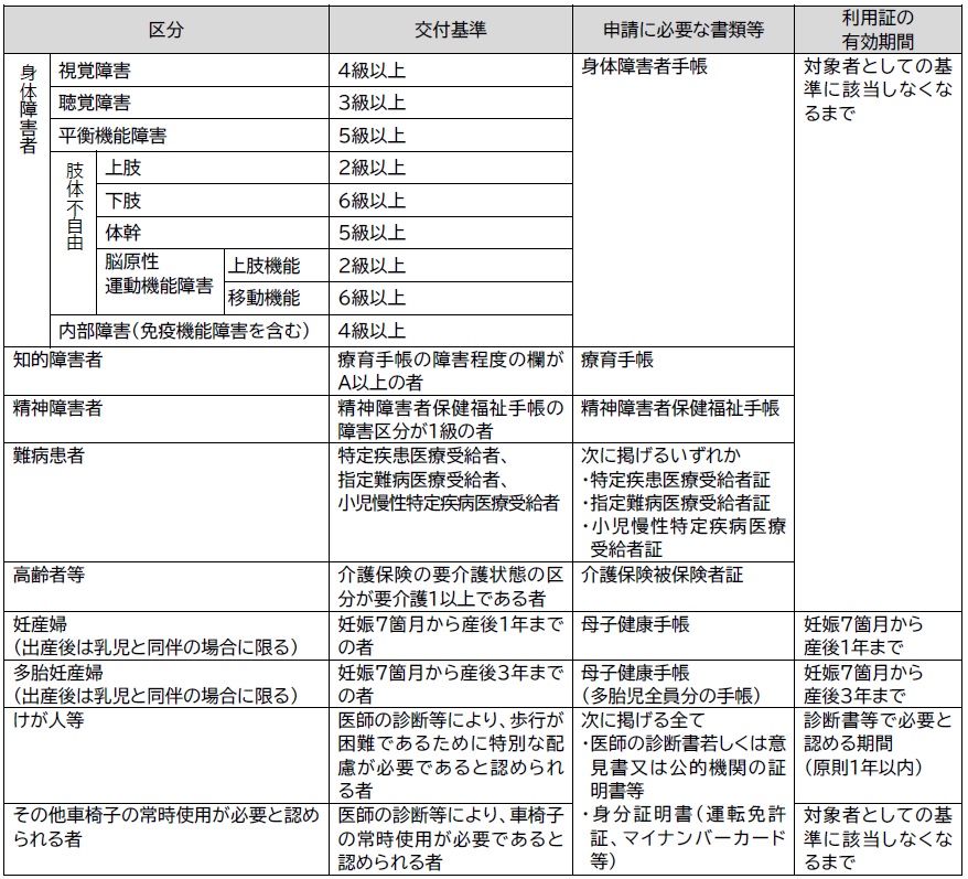 障害者手帳、難病関係受給者証、介護保険被保険者証、母子健康手帳などをお持ちの方のうち、交付基準を満たす方。