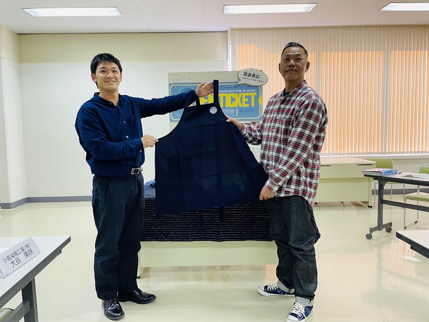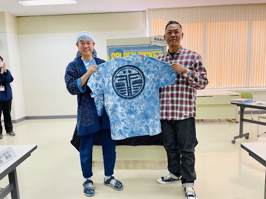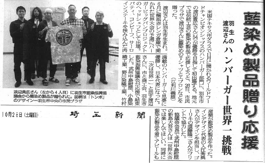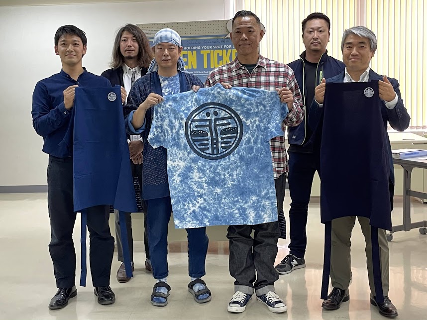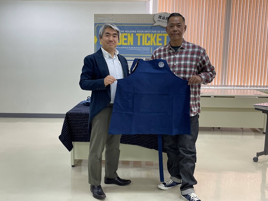 今年6月、横浜赤レンガ倉庫で開かれた世界最大級のフードスポーツイベント、そのハンバーガー部門「JAPAN BURGER CHAMPIONSHIP 2023」で見事全国一位となり、次はアメリカの世界大会に出場されることになられたチームのヘッドシェフ=渡邉貴広さん。羽生市藍染振興協議会では、渡邉さんに対しその応援の意を込めて藍染のTシャツとエプロンを贈呈しました。