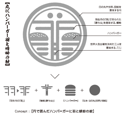 また、トンボは常に前進する縁起の良い「勝ち虫」として呼ばれていることから、トンボ、ハンバーガー、日の丸そして羽生の「羽」の字をコンセプトとしたマークをデザインし、エプロンには刺繍を、Tシャツにはバックプリントを施しました。