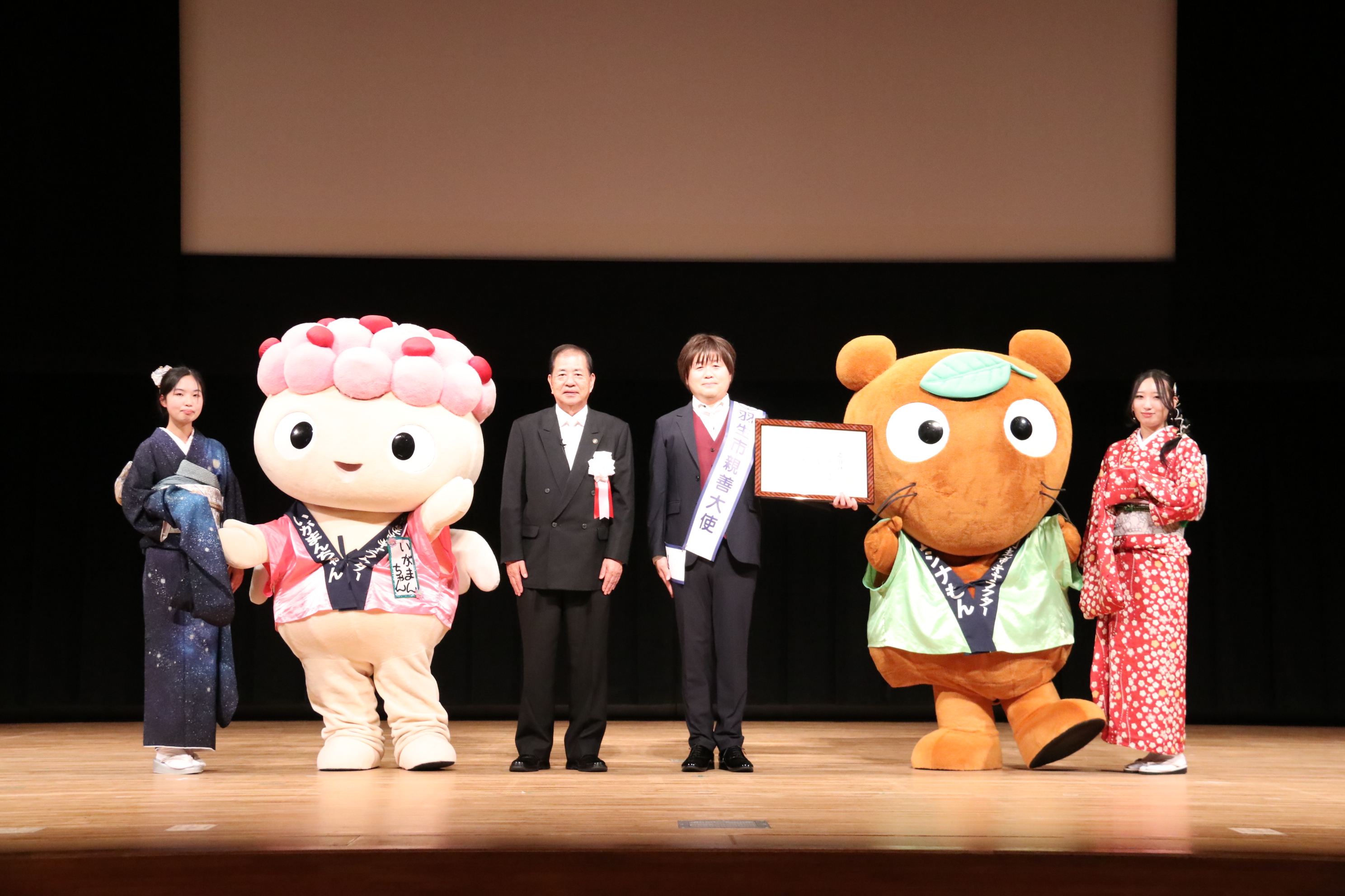 これまでも市のイベント等に数多く出演されてきた「さくまひでき」さんに、市制施行70周年記念式典で羽生市親善大使に就任していただきました。