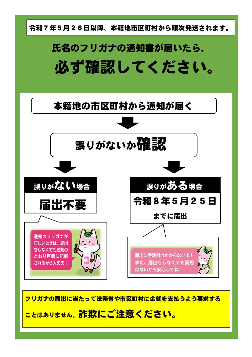 本籍地の市区村長から、住民票の情報を参考にして作られた「戸籍に記載される予定のフリガナ」が、2025年(令和7年)5月26日以降に圧着ハガキで通知されます。
