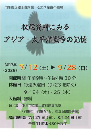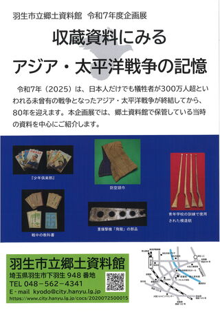 羽生市立郷土資料館では令和7年度企画展を開催します。今年は、日本人だけでも犠牲者が300万人超といわれる未曾有の戦争となったアジア・太平洋戦争が終結してから、80年の節目を迎えます。今回の企画展では、当館に収蔵されている軍服や学校関係の資料など戦争当時の資料を中心にご紹介いたします。是非、ご来館ください。