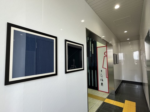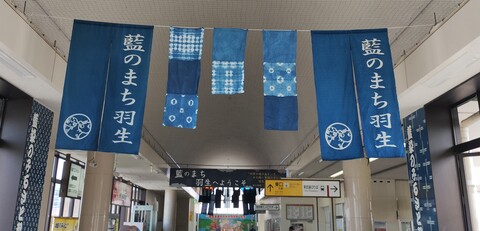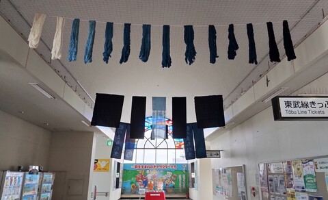 東武鉄道羽生駅のトイレリニューアルにあわせて、羽生市藍染振興協議会ご協力のもと、駅自由通路に藍染作品を展示いたしました。様々な藍染作品の装飾で、皆さまをお迎えしております。