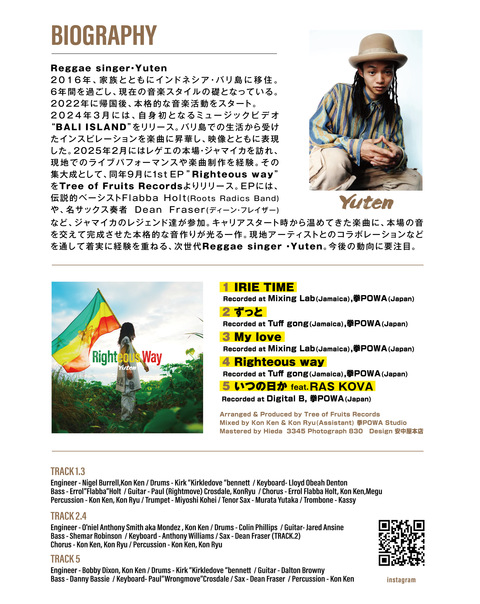 帰国後は本格的に音楽活動を開始し、2024年にはバリ島での経験を映像と音楽で表現したミュージックビデオ“BALI ISLAND”をリリース。 2025年にはレゲエの本場・ジャマイカでのライブや制作を経て、伝説的アーティストたちと制作した1st EP“Righteous way”を発表。 国境を越えて経験を重ねる、羽生発の次世代レゲエシンガーです。