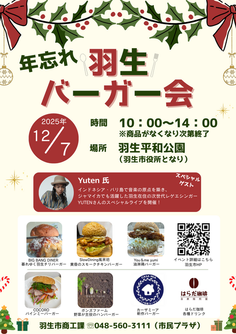今回は、過去出店の7店舗に加え、羽生市在住のレゲエシンガー・Yutenさんによる、心弾むスペシャルライブをお届けしました! 羽生バーガーをはじめとする地元の味覚と、Yutenさんの温かく力強い歌声で、一年の締めくくりにぴったりのひとときでした。