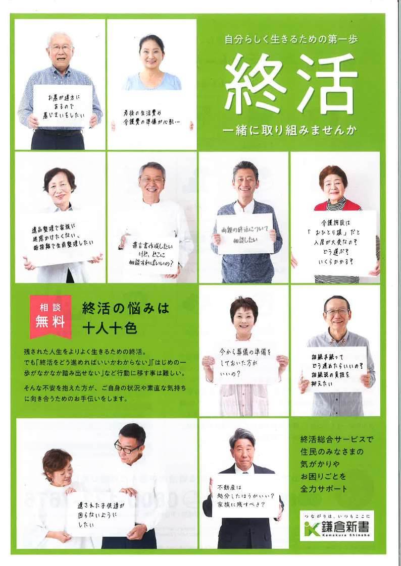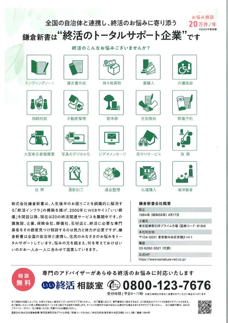 市民からの終活に関する相談対応として、鎌倉新書の専門のアドバイザーが様々な終活のお悩みについてサポートを行います。相談無料の終活相談室(いい終活相談室)を設置していますので、ぜひご活用ください。