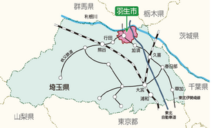 羽生市は、関東地方(かんとうちほう)のほぼ中央(ちゅうおう)、埼玉県(さいたまけん)の北東部(ほくとうぶ)にあります。都心(としん)から60km(キロメートル)、さいたま市浦和区(しうらわく)から40km(キロメートル)の距離(きょり)にあり、東(ひがし)と南(みなみ)は加須市(かぞし)、西(にし)は行田市(ぎょうだし)、北(きた)は利根川(とねがわ)を隔(へだ)てて群馬県(ぐんまけん)に隣接(りんせつ)しています。