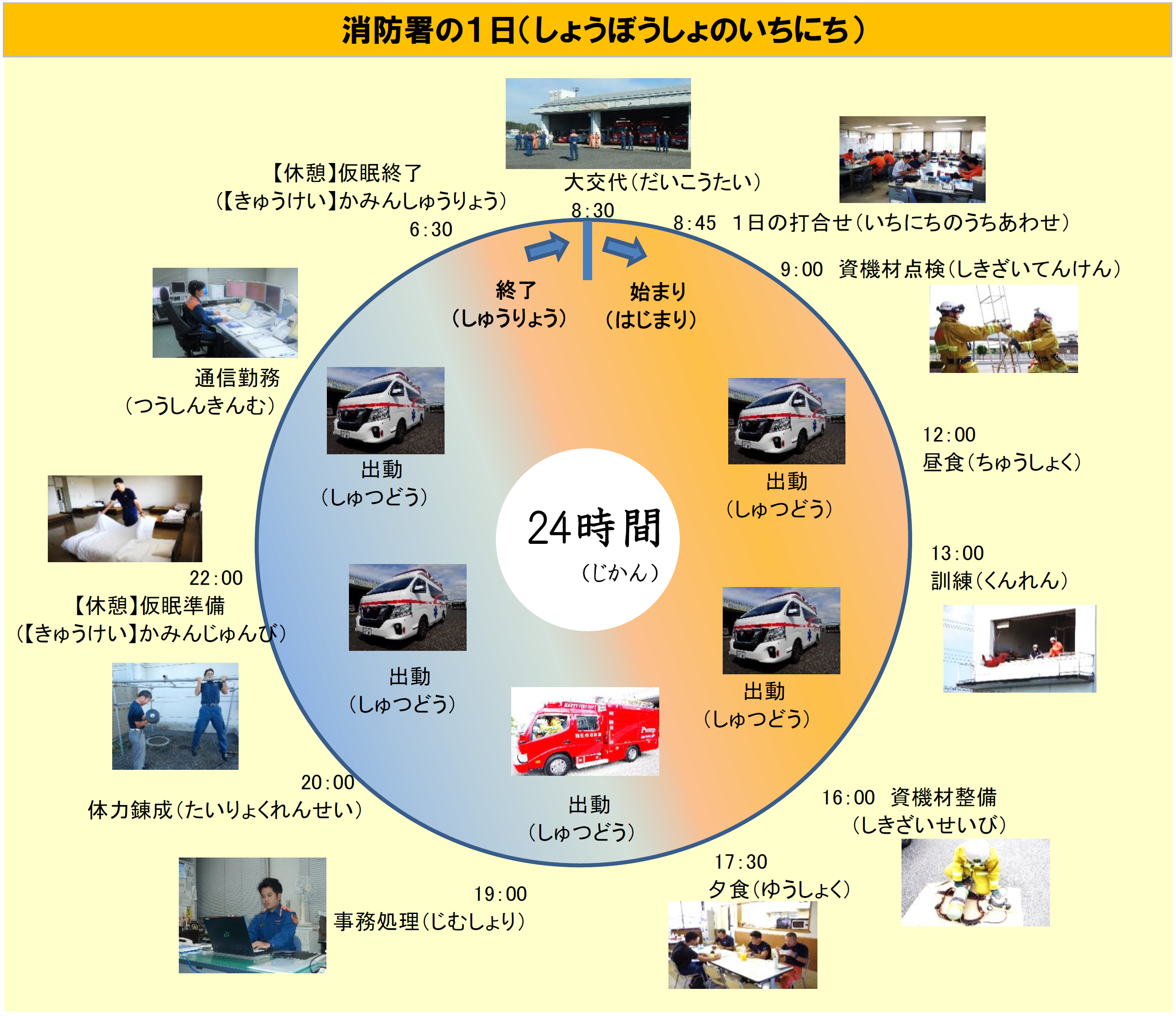 皆(みな)さんの安全(あんぜん)・安心(あんしん)を守(まも)るため、24時間(じかん)365日(にち)休(やす)みなく出動体制(しゅつどうたいせい)を整(ととの)える消防署(しょうぼうしょ)では、毎日(まいにち)どのようなお仕事(しごと)をしているのでしょうか。