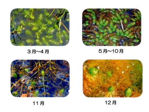 | 3月(がつ)~4月(がつ) | 気温(きおん)が上(あ)がるとムジナモが水面(すいめん)に浮(う)かびあがります。 |