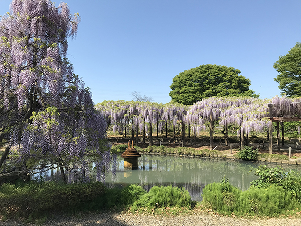 公園中央(こうえんちゅうおう)の噴水池(ふんすいいけ)の周(まわ)りを囲(かこ)むように約(やく)60本(ぽん)の紫(むらさき)と白(しろ)の藤(ふじ)や、立(た)ち藤(ふじ)やダルマフジも見(み)ることができます。