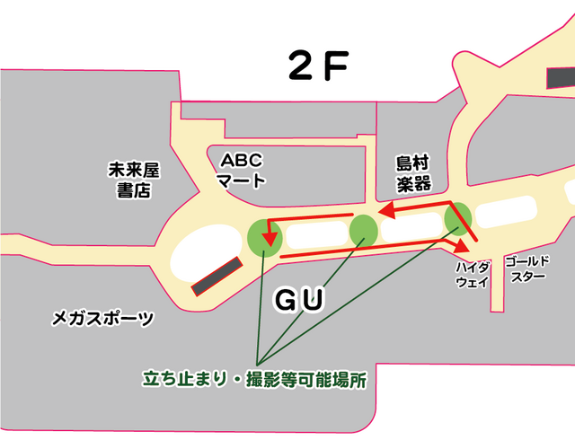 触れ合いや写真撮影など立ち止まって行うものは、通路と通路の間を挟むブリッジ(下記資料の緑色部分)にて可能です
