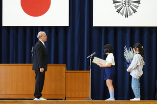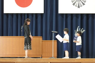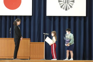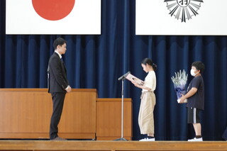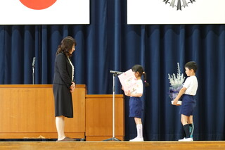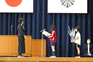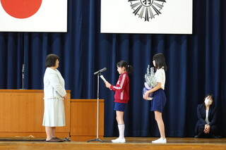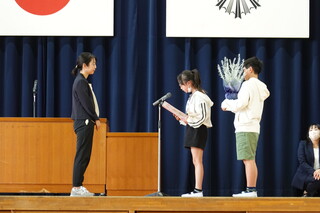 代表児童が、お礼のお手紙とお花を渡しました。