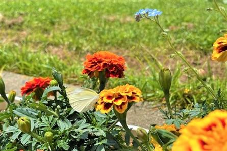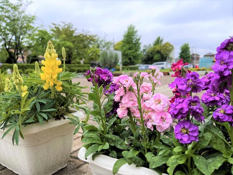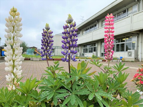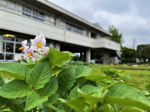 ふと学校ファームに目を落としますと、6年生が育てているジャガイモがかわいらしい花をつけていました。薄紫色の花びらと黄色いおしべのコントラストが目を引きます。めしべがおしべよりも飛び出ているのが分かりますが、それは自家受粉ができないようにするためのつくりだそうです。パンジー、ストック、ルピナスなど春のお花たちはそろそろ見頃過ぎとなります。代わりに、マリーゴールドが色鮮やかに咲きそろってきました。
