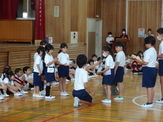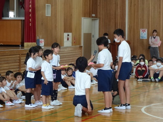 1年生は、あさがおの種と校歌の歌詞ブックをもらいました。
