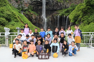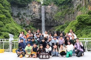 華厳の滝では、迫力のある滝を背景に記念写真を撮りました。