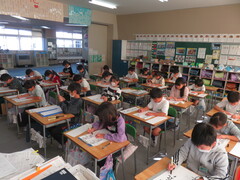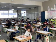 お手本をよく見ながら丁寧に書くことができました。鉛筆で書く時にも、「とめ」「はね」「はらい」などに気をつけて、美しい字を目指してほしいと思います。