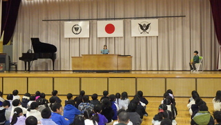 2学期の終業式が行われました。校長先生からは、2学期を振り返り、子供たちの成長や頑張りについてお話がありました。また、2・5年生の2人の代表児童が2学期に頑張ったことや3学期の目標を全校の前で堂々と発表しました。