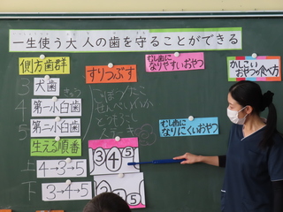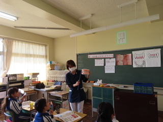 歯科衛生士さんを講師としてお招きし、2年生は「第一大臼歯の大切さ」、4年生「一生使う大人の歯を守ることができる」、6年生「噛むことの大切さがわかる」をテーマにお話をいただいて、歯のみがき方を教わりました。