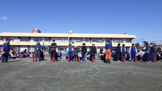 火災からの避難、初期消火の訓練をしました。「火事だ」の大きい声を出した後、ホースを向けてからピンを抜いてレバーを握る消火器の使い方を消防署の方々に教わりました。