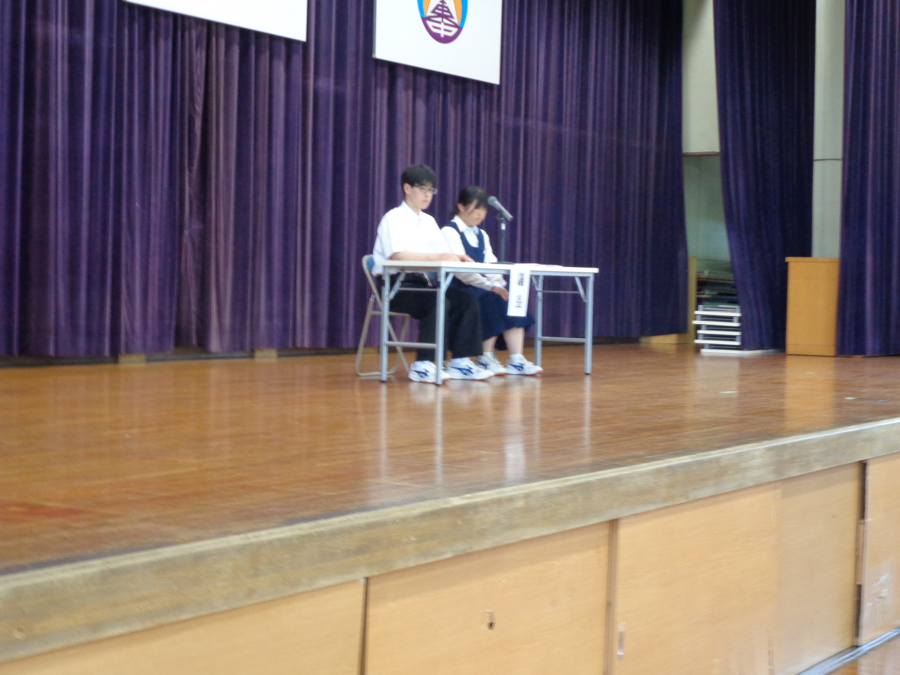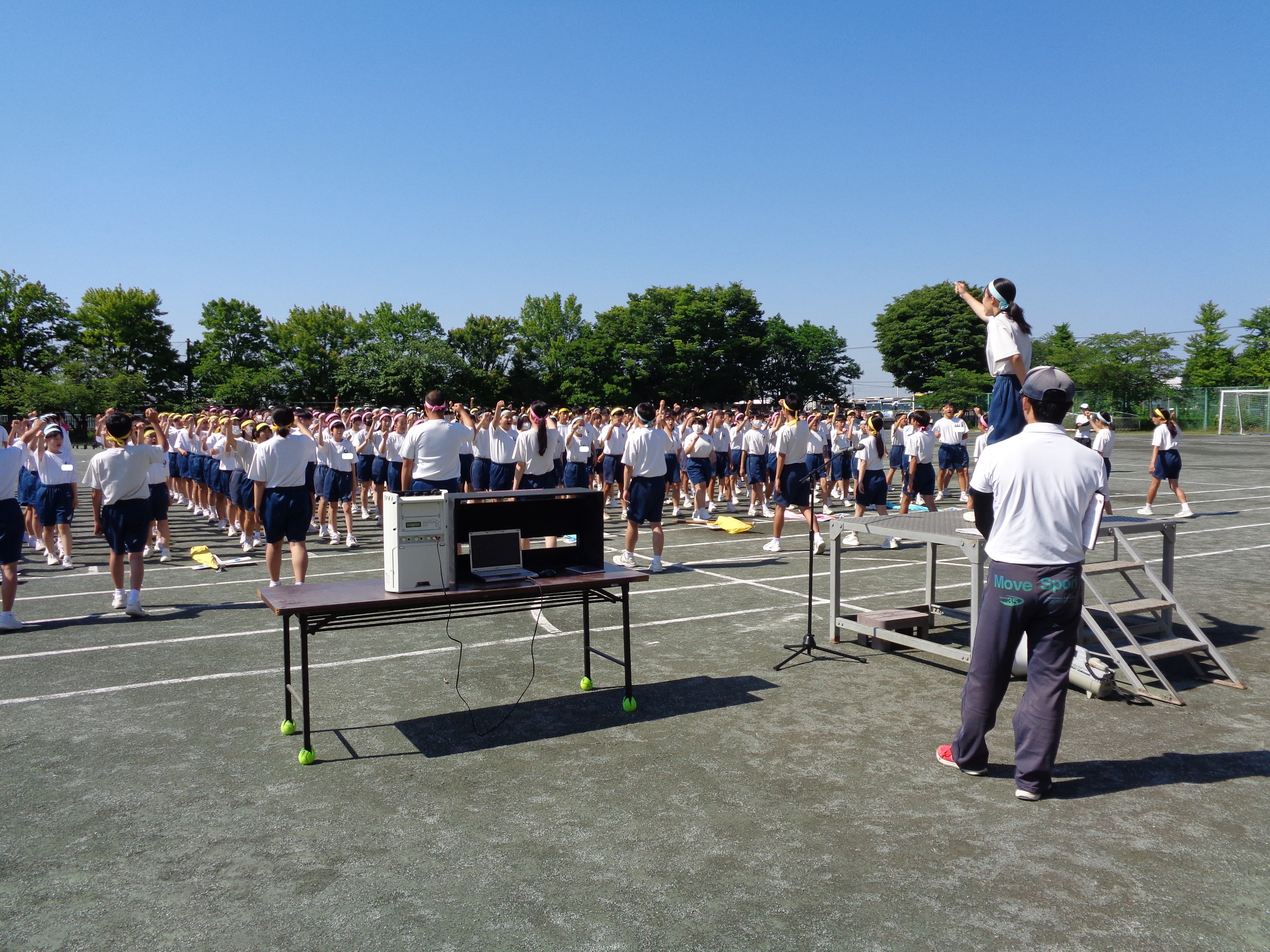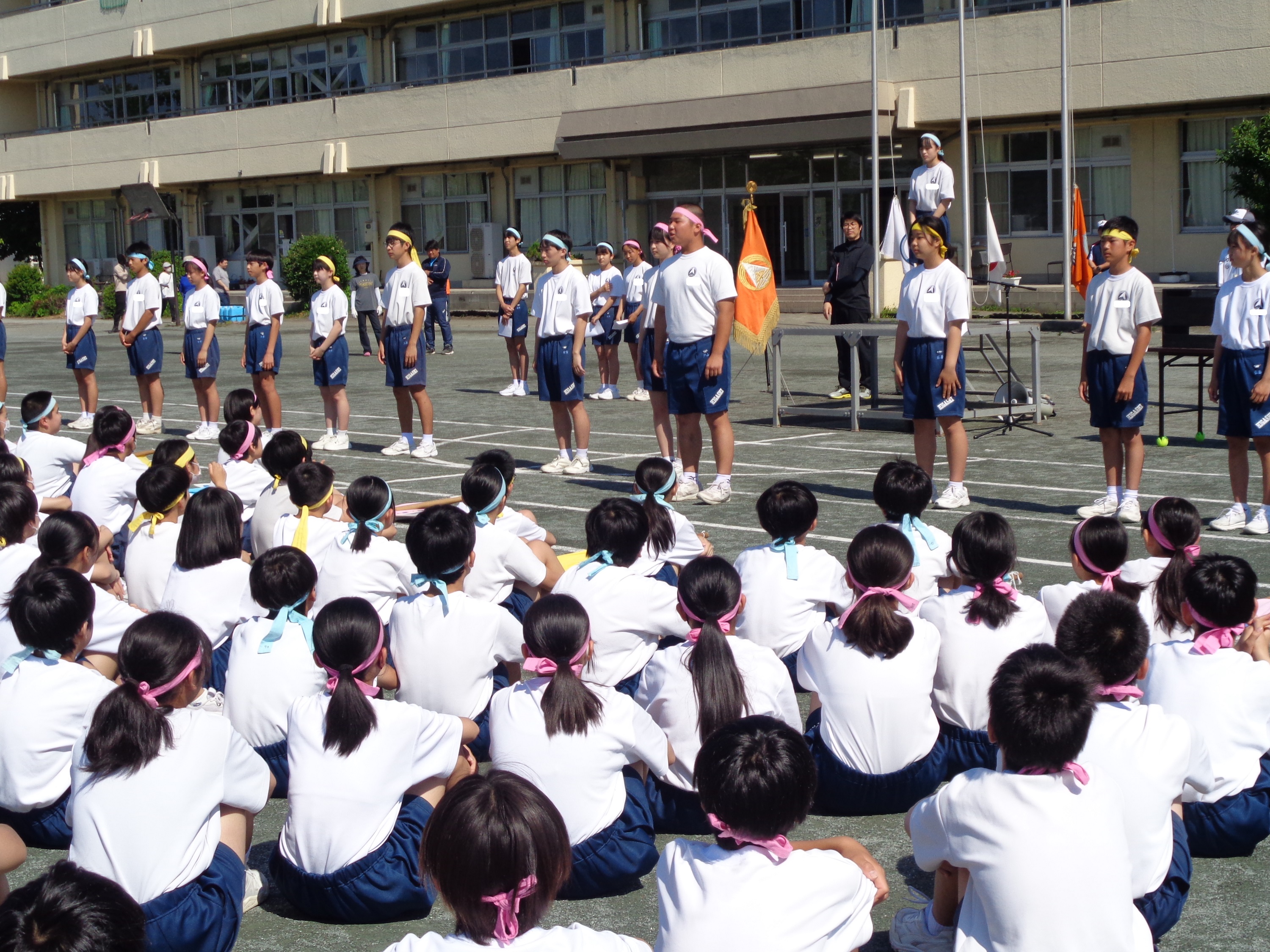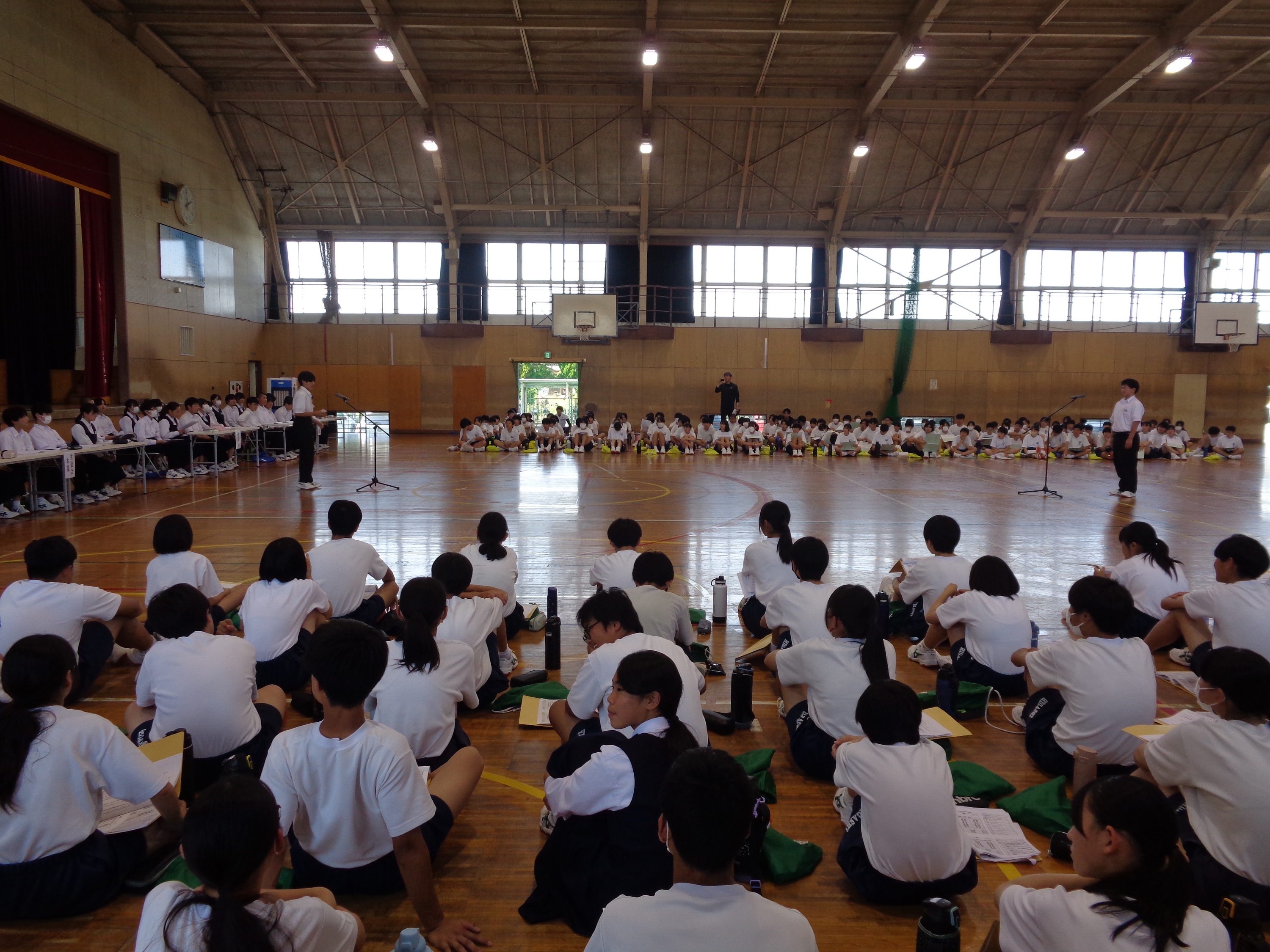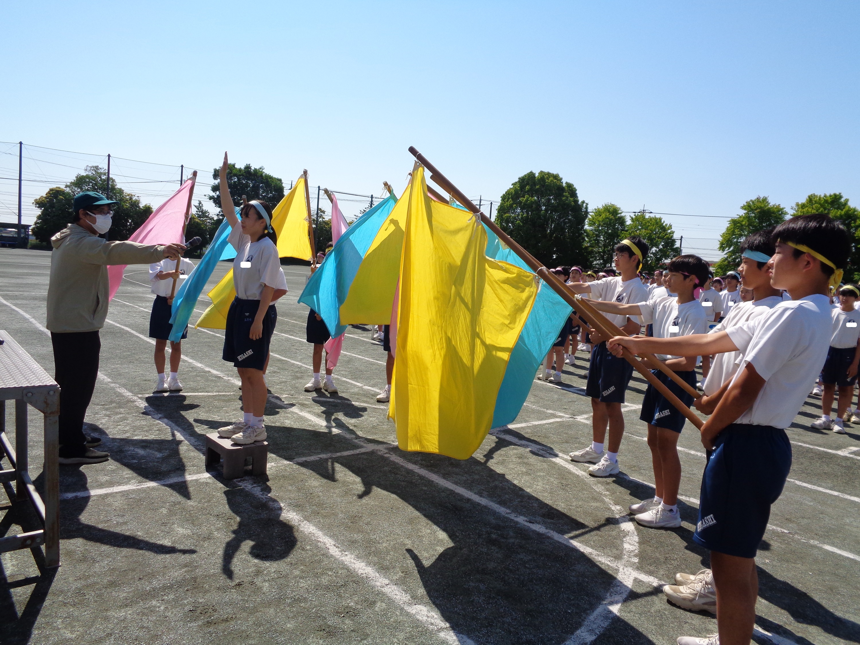 本日午前、全体での体育祭練習が行われました。練習の前には生徒集会が開かれ、各クラスの体育委員さんから体育祭に向けた意気込みが発表(「クラスが一丸となれるよう頑張ります。」「どの学年にとっても、今年が一番の体育祭になるように頑張ります。」)されました。