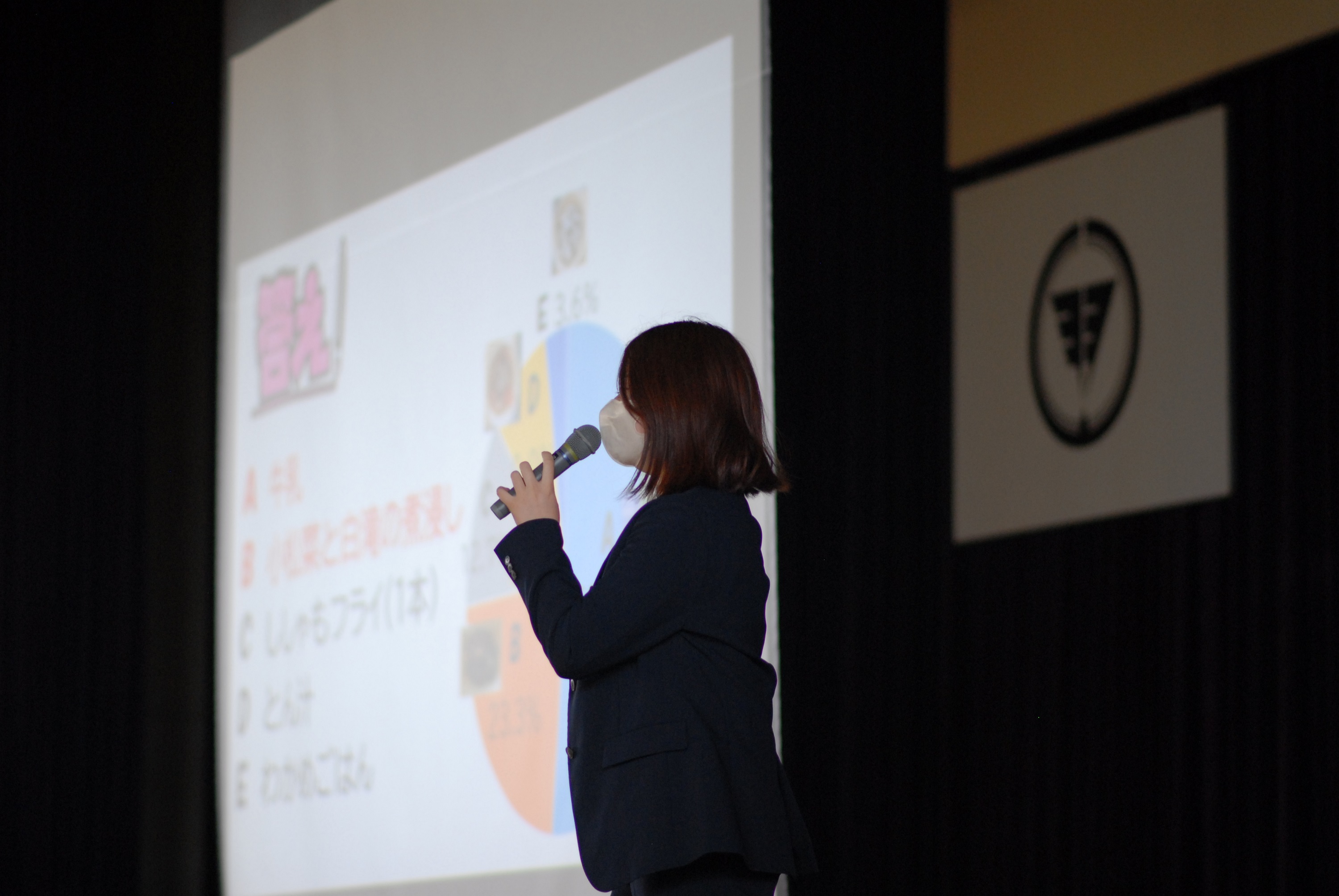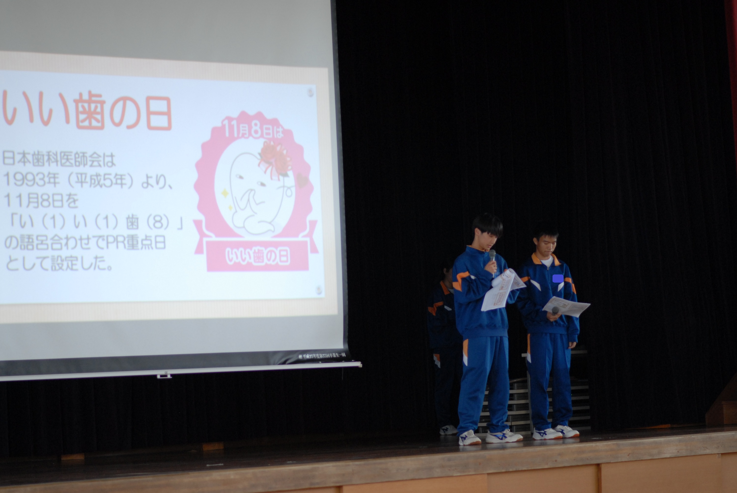公開日 2025年11月10日 12時00分 11月6日(木) 学校保健委員会 11月8日はいい歯の日です。「いい歯の日キャンペーン」として保健委員会の発表と西中学校の栄養教諭さんから食育と健康について講話が行われました。