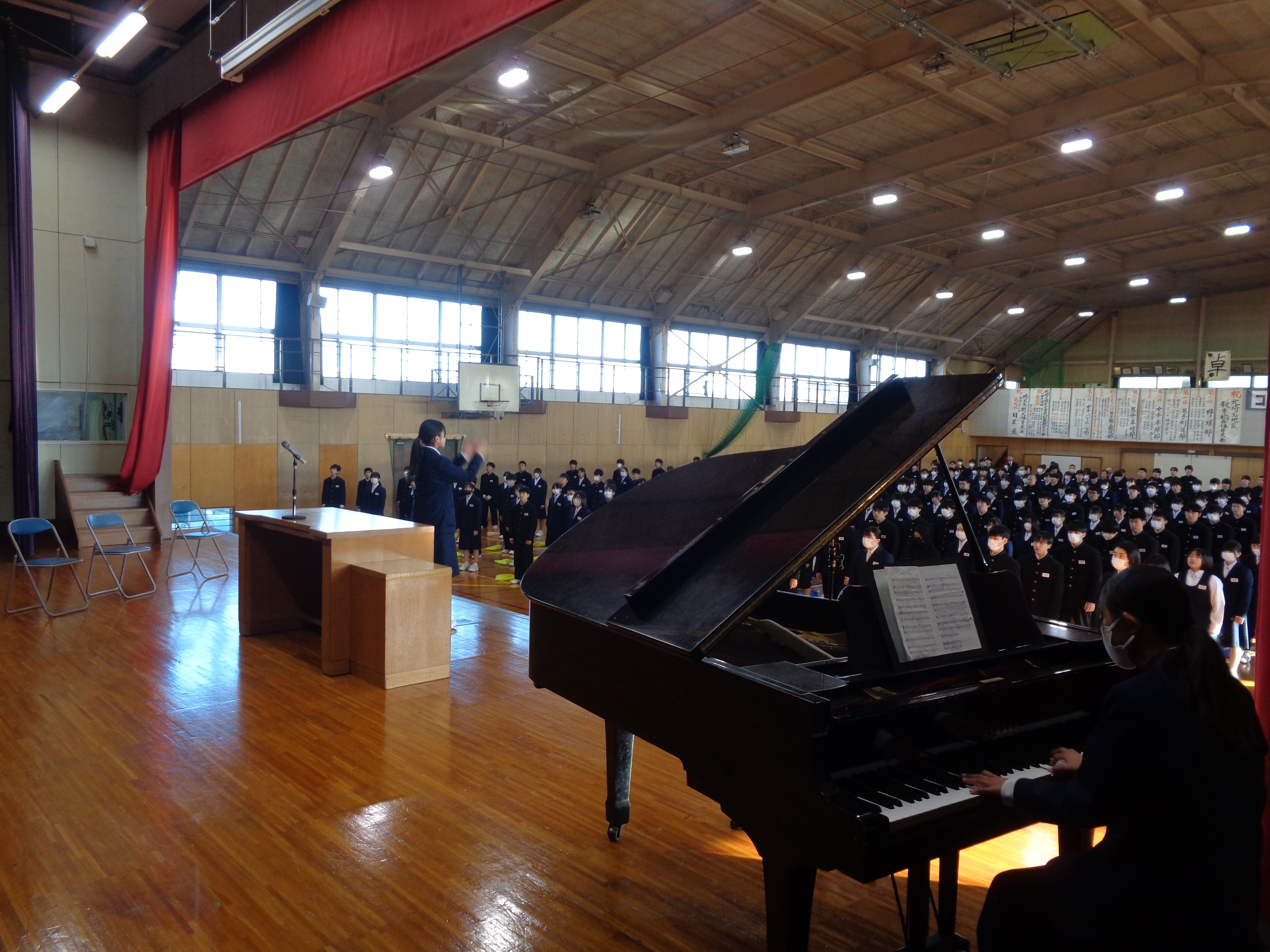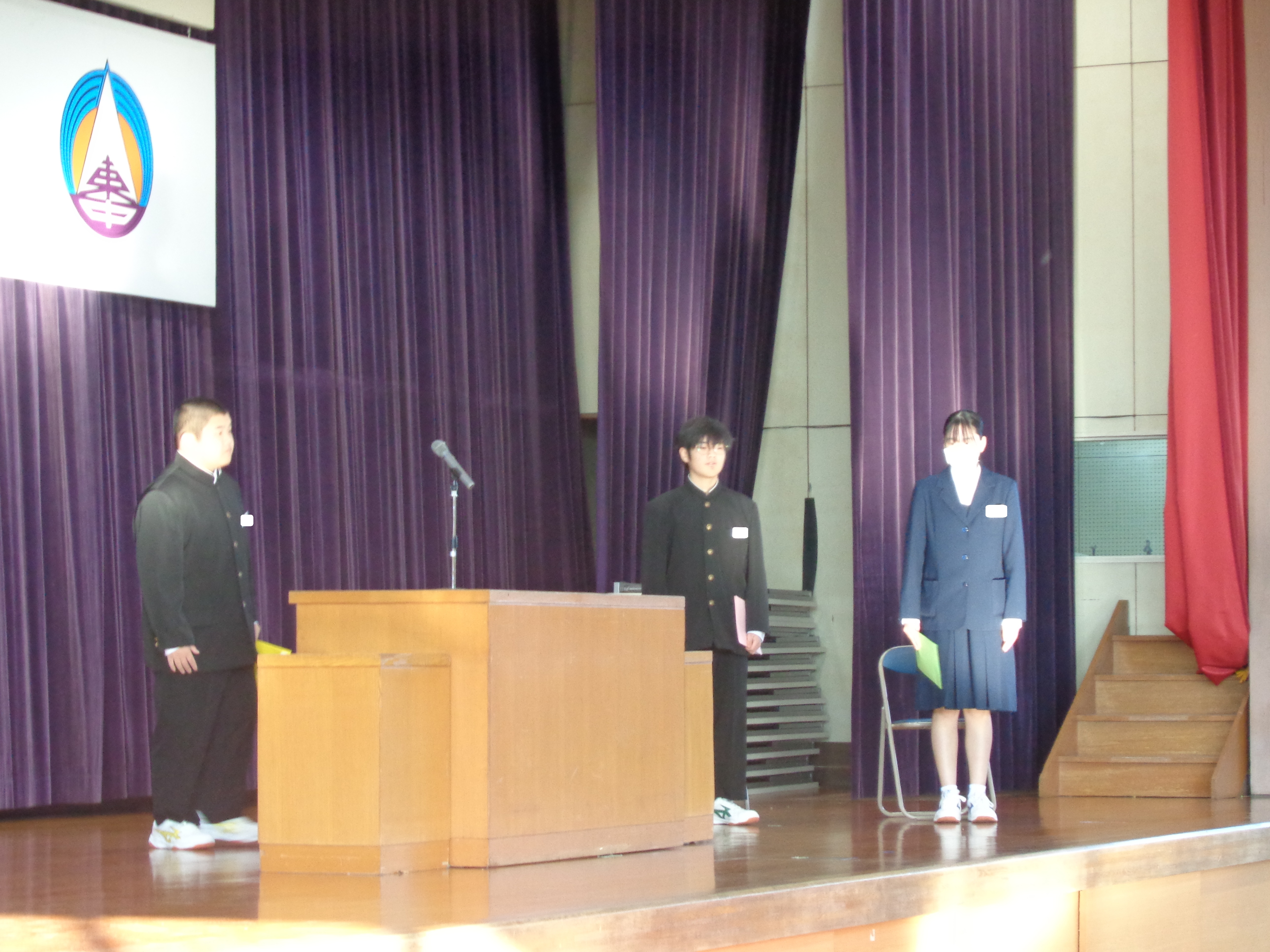 本日、3学期始業式が行われました。式では生徒発表(1年生:スキー学校で団結力を高める。1年のまとめをしっかり行い、2年生になる準備を始める。2年生:校外学習では責任をもって計画・実行。学習・生活を充実させ、3年生に進級する準備。3年生:未来のため、応援してくれる人のために悔いのない学期にしていく。)がありました。