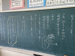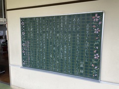 1号館1階放送室前には、作文黒板があります。1か月に1度児童の作文を紹介しています。