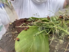 昼休みに校内にある畑で2年生が集まっていました。何だろうと??と見ていてみると虫捕りをしていました。籠の中にはテントウムシやバッタがいました。