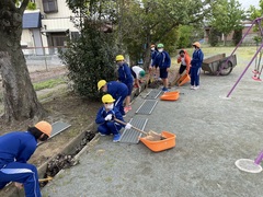 外掃除の児童は排水溝にたまった落ち葉や土を取り除いています。そこにはカエルやミミズがいました。