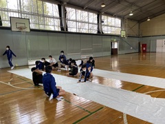 健康観察後、体育館に移動をしました。体育館への移動や他の学年を待っている間話さずにできました。