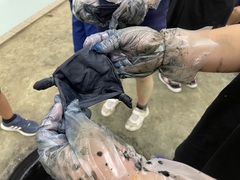 高齢者疑似体験ー体に運動の制限をかけ、重りをつけて歩きました。