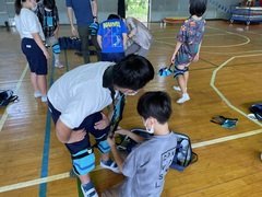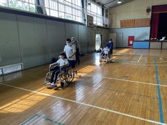 車椅子体験 ー車椅子の操作方法、坂道や下り坂での補助を行いました。