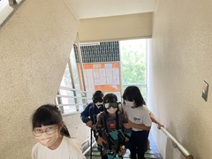 アイマスク体験ーアイマスクをして、白杖を持ち、段差のある場所をペアで行いました。
