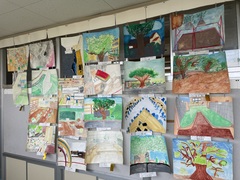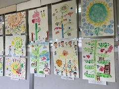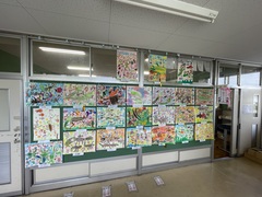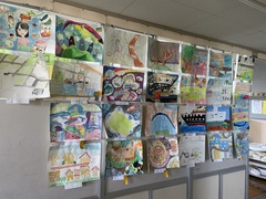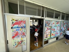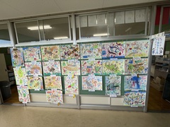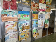 廊下にはそれぞれの学年が描いた絵の作品が展示しています。校内絵画展は来月3日(月)~7日(金)です。