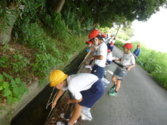 13日(火)に生活科の学習でザリガニ釣りを行いました。学校からしばらく歩いていくと用水路に着きました。