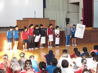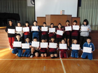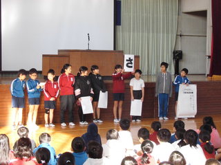 11月7日(木)朝の活動は全校朝会がありました。初めに児童会から11月の生活目標について発表がありました。11月は、県や市でも強調されている「いじめ撲滅強調月間」を受けて、児童会が考えた目標は「思いやりのある行動をしよう」でした。また、あいさつについての合言葉も児童会から発表がありました。学校からは、子どもたちの交通事故防止について指導しました。最後には、地域の皆様が審査員となって選ばれた、川柳の優秀作品の表彰を行いました。