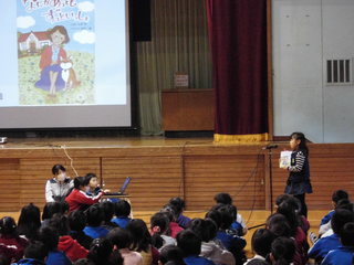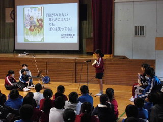12月6日(金)朝の活動は、全校ビブリオ集会が行われました。児童会図書委員会の児童が中心となって司会進行を進めました。今回は、学年代表のチャンプ本に選ばれた本の紹介を、1年生と4年生代表の児童が発表をしました。本の紹介の後、全校児童から質問や感想発表をする時間があり、どの学年からもたくさんの質問がありました。全校集会の回数を重ねていくうちに、発表する児童の紹介する本のレベル、発表の仕方、さらに質問する児童の内容のレベルも上がりました。これから冬休みに入りますが、一人でも多くの児童が読書に関心を持ってもらえればと願っています。