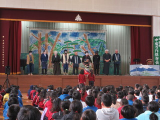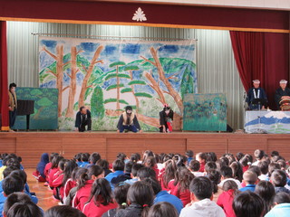 12月11日(水)地域の郷土芸能「万作芝居」を地域の方が上演してくれました。この事業は、コミュニティースクール協議会において、子どもたちに地域の歴史や郷土芸能を伝えていきたいという願いから上演されたものです。当日に至るまで、地域の方が上演に必要な環境を整えるために、体育館ステージの幕を直していただいたり、準備を進めていました。地域に伝わる「万作芝居」を今までに見たことのない児童がたくさんいました。
