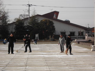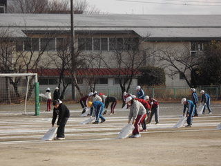 1月17日(金)午後から、校庭に塩カル蒔きを、6年生の児童がおやじの会の皆様のご支援をいただいて行いました。おやじの会の皆様が重い塩カルの袋を倉庫から校庭に運び、子どもたちが穴の開いた袋をマスク、ゴーグルを身に付けまいていきました。また、学校の廃棄備品の運搬もやっていただき、大変助かりました。仕事の合間を使って、おやじの会の皆様10名近くが手伝ってくださいました。大変ありがとうございました。