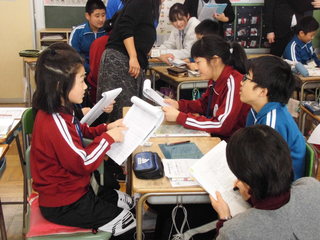 1月22日(水)今年度第5回目の英会話科による授業研究会を実施しました。5年2組が「What would you like?」の単元を深谷市の中学校の先生を指導者にお招きして指導をいただきました。子どもたちが、レストランに行って注文する場面を英語を使って、英会話を深めました。今回は、日常に使える英会話を目指して、決められた会話の他に「plus one」を加えて自然な会話ができるように試みました。スタッフとお客になって、会話をし、参観した職員にも子どもたちが役割演技の協力をお願いしました。職員からも決められた会話以外にも、plus oneの質問を子どもたちに積極的にしていました。