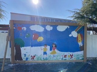4年生から6年生までの絵画工作クラブの児童が作成した「IWASE スマイルロード」の表示と、自転車置き場の壁面を使った絵が飾られました。
